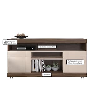 ESPECIFICAÇÕES: Estrutura em MDP Pintura UV 2 Portas Dobradiças metálicas Detalhes em friso nas portas Prateleira e nicho Rodízios embutidos Ideal para TV até 47