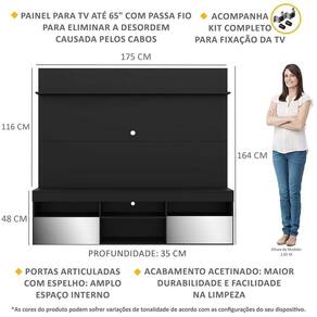Dimensões do produto montado: Altura: 164cm | Largura: 175cm | Profundidade: 35cm *Devido as variações de tamanho dos televisores no mercado, sugerimos que verifique as medidas da sua TV e compare com o painel antes de efetuar a compra. *Você pode consultar as medidas internas na imagem técnica do produto.
