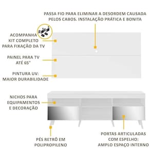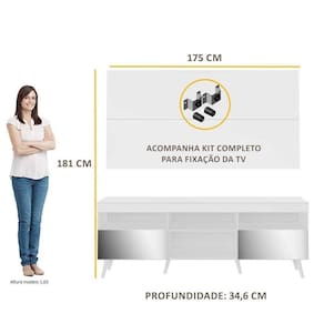 A sala de estar é o melhor lugar para receber a família e amigos, por isso ter um ambiente bonito e aconchegante é fundamental. O Rack com Painel e Suporte para TV 65" com Espelho e Pés Retrô Flórida Multimóveis é uma ótima opção para aproveitar seu espaço de maneira inteligente. Produzido em MDP com pintura UV, que garante maior durabilidade e facilidade na limpeza, possui espaço para os equipamentos eletrônicos e nichos para objetos decorativos, além de duas portas articuladas com espelho e um amplo espaço interno para manter seus pertences organizados. O painel para TV de até 65 possui espaçamento para passagem dos fios, que permite deixar os cabos mais organizados. Devido as variações de tamanho dos televisores no mercado, sugerimos que verifique as medidas da sua TV e compare com o painel antes de efetuar a compra.Para facilitar a sua vida, este produto acompanha também o kit para fixação da TV. Muito prático e de fácil instalação, pode ser utilizado para TVs LCD, LED e plasma de 14 a 71. Totalmente sobreposto, acompanha gabarito de montagem que auxilia na instalação. Conta com um sistema de encaixe rápido, possui 16mm de deslocamento que permite o ajuste do encaixe das peças. Os espelhos são de vidro (o que evita que a imagem fique distorcida) e lapidados, ou seja, passam por um processo para que as bordas não fiquem cortantes, o que garante maior segurança.Os pés palito, estilo retrô, em polipropileno, dão um charme especial ao móvel deixando-o com um visual leve e permitindo você compor um ambiente com ar vintage e moderno ao mesmo tempo.No mercado moveleiro desde 1995, a Multimóveis utiliza tecnologia de ponta e se diferencia através do acabamento superior, demonstrando o cuidado e carinho na fabricação dos móveis. Utilizamos matéria-prima de madeira proveniente de reflorestamento, que contribui para a preservação do meio ambiente.Tamanho Painel TV: 175 x 90cmDevido as variações de tamanho dos televisores no mercado, sugerimos que verifique as medidas da sua TV e compare com o painel antes de efetuar a compra.Dimensões do produto montado:Painel - Altura: 90cm | Largura: 175cm | Profundidade: 2,5cmRack - Altura: 63,6cm | Largura: 175cm | Profundidade: 34,6cmDisponível em 9 opções de cores: Branco Branco/Preto Branco/Natural Preto Preto/Branco Preto/Natural Duna/Branco Duna/Preto Duna/Natural.As cores do produto podem sofrer variações de tonalidade de acordo com as configurações do seu monitor/celular.Imagem meramente ilustrativa. Decoração não acompanha o produto.Produto NOVO acompanha nota fiscal, manual de montagem e certificado de garantia.O produto será entregue desmontado e a Multimóveis não disponibiliza o serviço de montagem.