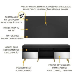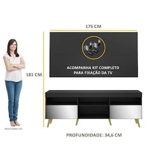 A sala de estar é o melhor lugar para receber a família e amigos, por isso ter um ambiente bonito e aconchegante é fundamental. O Rack com Painel e Suporte para TV 65" com Espelho e Pés Retrô Flórida Multimóveis é uma ótima opção para aproveitar seu espaço de maneira inteligente. Produzido em MDP com pintura UV, que garante maior durabilidade e facilidade na limpeza, possui espaço para os equipamentos eletrônicos e nichos para objetos decorativos, além de duas portas articuladas com espelho e um amplo espaço interno para manter seus pertences organizados. O painel para TV de até 65 possui espaçamento para passagem dos fios, que permite deixar os cabos mais organizados. Devido as variações de tamanho dos televisores no mercado, sugerimos que verifique as medidas da sua TV e compare com o painel antes de efetuar a compra.Para facilitar a sua vida, este produto acompanha também o kit para fixação da TV. Muito prático e de fácil instalação, pode ser utilizado para TVs LCD, LED e plasma de 14 a 71. Totalmente sobreposto, acompanha gabarito de montagem que auxilia na instalação. Conta com um sistema de encaixe rápido, possui 16mm de deslocamento que permite o ajuste do encaixe das peças. Os espelhos são de vidro (o que evita que a imagem fique distorcida) e lapidados, ou seja, passam por um processo para que as bordas não fiquem cortantes, o que garante maior segurança.Os pés palito, estilo retrô, em polipropileno, dão um charme especial ao móvel deixando-o com um visual leve e permitindo você compor um ambiente com ar vintage e moderno ao mesmo tempo.No mercado moveleiro desde 1995, a Multimóveis utiliza tecnologia de ponta e se diferencia através do acabamento superior, demonstrando o cuidado e carinho na fabricação dos móveis. Utilizamos matéria-prima de madeira proveniente de reflorestamento, que contribui para a preservação do meio ambiente.Tamanho Painel TV: 175 x 90cmDevido as variações de tamanho dos televisores no mercado, sugerimos que verifique as medidas da sua TV e compare com o painel antes de efetuar a compra.Dimensões do produto montado:Painel - Altura: 90cm | Largura: 175cm | Profundidade: 2,5cmRack - Altura: 63,6cm | Largura: 175cm | Profundidade: 34,6cmDisponível em 9 opções de cores: Branco Branco/Preto Branco/Natural Preto Preto/Branco Preto/Natural Duna/Branco Duna/Preto Duna/Natural.As cores do produto podem sofrer variações de tonalidade de acordo com as configurações do seu monitor/celular.Imagem meramente ilustrativa. Decoração não acompanha o produto.Produto NOVO acompanha nota fiscal, manual de montagem e certificado de garantia.O produto será entregue desmontado e a Multimóveis não disponibiliza o serviço de montagem.