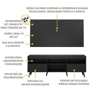 Produzido em MDP com pintura UV, que garante maior durabilidade e facilidade na limpeza, possui espaço para os equipamentos eletrônicos e nichos para objetos decorativos, além de duas portas articuladas com um amplo espaço interno para manter seus pertences organizados. Opainel para TV de até 65possui espaçamento para passagem dos fios, que permite deixar os cabos mais organizados. Devido as variações de tamanho dos televisores no mercado, sugerimos que verifique as medidas da sua TV e compare com o painel antes de efetuar a compra.