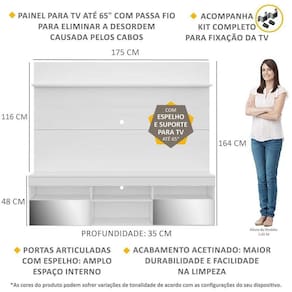 Dimensões do produto montado: Altura: 164cm | Largura: 175cm | Profundidade: 35cm *Devido as variações de tamanho dos televisores no mercado, sugerimos que verifique as medidas da sua TV e compare com o painel antes de efetuar a compra. *Você pode consultar as medidas internas na imagem técnica do produto.