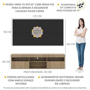 Dimensões do produto montado: Painel - Altura: 90cm | Largura: 175cm | Profundidade: 2,5cm Rack - Altura: 48cm | Largura: 175cm | Profundidade: 35cm *Devido as variações de tamanho dos televisores no mercado, sugerimos que verifique as medidas da sua TV e compare com o painel antes de efetuar a compra. *Você pode consultar as medidas internas na imagem técnica do produto.