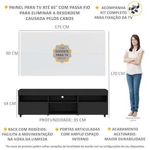 Conteúdo da Embalagem: 1 (um) rack com painel para TV 1 (um) kit com 6 (seis) rodízios 1 (um) kit com suporte para TV