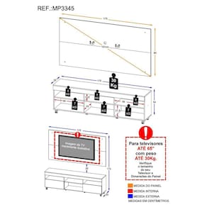 Dimensões do produto montado: Painel - Altura: 90cm | Largura: 175cm | Profundidade: 2,5cm Rack - Altura: 54cm | Largura: 175cm | Profundidade: 35cm *Devido as variações de tamanho dos televisores no mercado, sugerimos que verifique as medidas da sua TV e compare com o painel antes de efetuar a compra. *Você pode consultar as medidas internas na imagem técnica do produto.