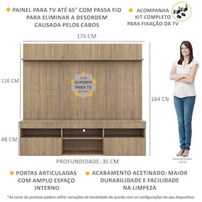 Dimensões do produto montado: Altura: 164cm | Largura: 175cm | Profundidade: 35cm *Devido as variações de tamanho dos televisores no mercado, sugerimos que verifique as medidas da sua TV e compare com o painel antes de efetuar a compra. *Você pode consultar as medidas internas na imagem técnica do produto.
