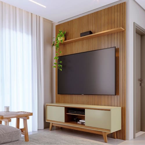 Características: Estrutura: MDP/MDF Painel Frisado Revestimento: Pintura UV 2 Portas de Correr 2 Prateleiras Suporta TV até 65 polegadas Peso suportado do painel:1 á 30Kg Peso suportado do rack: 1 á 30kg Com pés