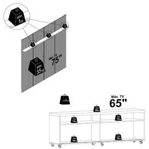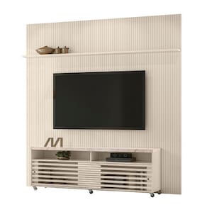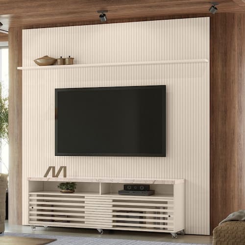 Características: Estrutura: MDP/MDF Painel Frisado 2 Portas de Correr frisadas que se sobrepõem Revestimento: Pintura DIP 1 Prateleiras 2 Puxadores Rodízios: Silicone Suporta TV até 65 polegadas Peso suportado do painel: 1 á 35Kg Peso suportado do rack: 10 á 50kg