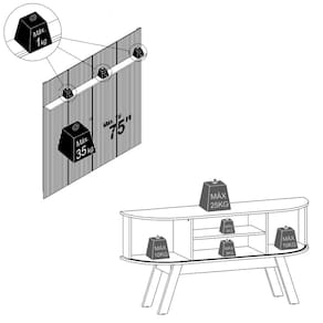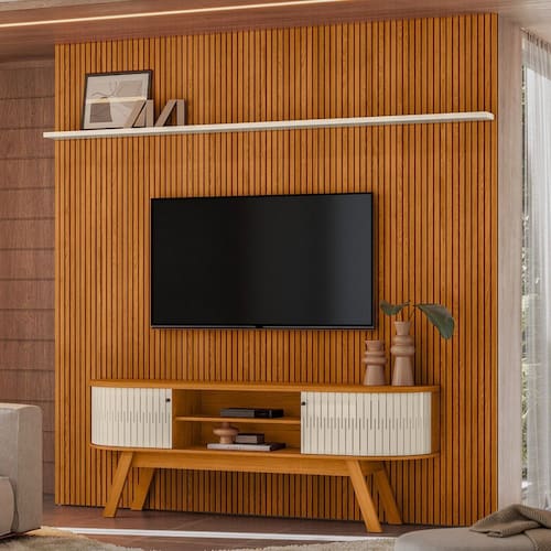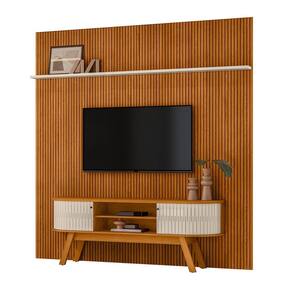 Características: Estrutura: MDP e MDF Revestimento: Pintura DIP 2 Portas Flexíveis 2 Prateleiras Puxadores: em plástico Tampo e base com detalhes curvos Suporta TV até 75 polegadas Peso suportado do painel: 1 á 35Kg Peso suportado do rack: 2 á 25kg Pés Retrô
