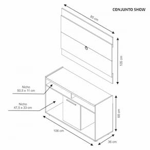 Dimensoes do Rack: Altura: 68 cm Largura: 106 cm Profundidade: 36 cm