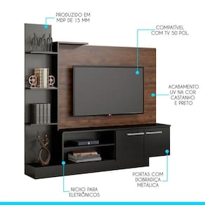 Rack Com Painel Para Tv 50 Pol 165x155cm Mdp Menu Móveis Castanho Quer deixar sua sala mais completa e elegante? Entao invista agora no Home TV Cairo. Com um design atual e super funcional, ele vai transformar a decoracao do seu ambiente. Possui nichos para eletronicos, prateleira para decoracao e duas portas para manter tudo sempre organizado. Produzido com materiais de excelente qualidade, garantindo a sua resistencia e mantendo sua beleza e funcionalidade por muito mais tempo. O melhor em moveis no design atual aliando conforto, qualidade e otimos precos, so na Menu Moveis! Caracteristicas: Produzido em MDP de 15 mm Acabamento UV Portas com Dobradica Metalica Puxadores Alca em ABS Cromado Para TVs ate 50 Pol.