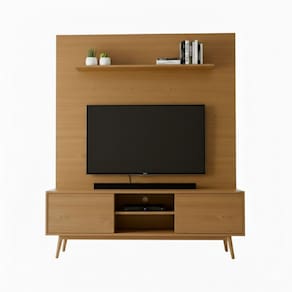 O conjunto é composto por rack com portas de correr, painel de parede, prateleira superior e base com pés palito, oferecendo organização, praticidade e um visual sofisticado. Suporta TVs de até 75 polegadas.