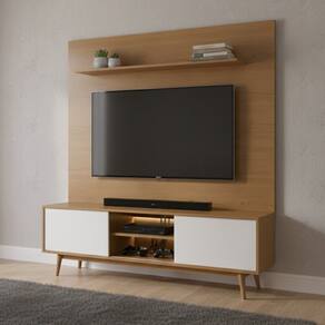 O conjunto é composto por rack com portas de correr, painel de parede, prateleira superior e base com pés palito, oferecendo organização, praticidade e um visual sofisticado. Suporta TVs de até 75 polegadas.