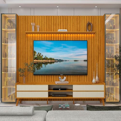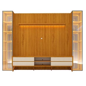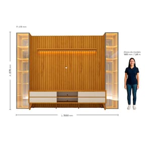 O Conjunto Painel Nobre Clean Rack Magnífico 2 Torres Luminare combina elegância e praticidade em um só produto. Com acabamento ripado autêntico em MDF, iluminação LED quente, rack com gavetas ripadinhas e corrediças telescópicas, além de torres com portas em vidro reflecta, o conjunto garante sofisticação e funcionalidade para sua sala. Produto Montado: Sim Acabamento: Pintura UV Acabamento da Gaveta: Pintura UV Acabamento da Porta: Vidro Acabamento da Prateleira: Pintura UV Acabamento dos Pés: Pintura Acompanha Lâmpada: Não Acompanha Manual de Instalação: Sim Altura do Conjunto: 237 cm Altura do Espelho: 106,3 cm Altura do Painel: 217 cm Altura do Rack: 59,6 cm Altura dos Pés: 20 cm Altura Máxima dos Pés: 20.0000 Ambiente Principal: Sala de Estar codigo_ean: 7900288220776 Complexidade da Montagem: Alta: deve ser montado por um montador especializado Cor: Naturale/Off White Cor do Produto: Naturale/Off White Cor Flex: Não Cor Interna: Off White Escala de Brilho: Semi-Fosco Escala de Brilho da Gaveta: Brilhante Escala de Brilho da Porta: Brilhante Escala de Brilho da Prateleira: Brilhante Espessura do Espelho: 3 mm Espessura do Painel: 24,6 cm Espessura do Tampo: 15 mm Espessura do Vidro: 3 mm Fixação na Parede: Sim Formato do Espelho: Retangular Gaveta com Chave: Não Ideal para TVs até (Polegadas): 84 Informações Complementares: Iluminação por fita LED. Fixação dos espelhos da torre por encaixe/apoio. Itens Inclusos: 1 Rack, 1 Painel, Kit Ferragens e Manual de Montagem Largura do Conjunto: 305 cm Largura do Espelho: 35,1 cm Largura do Painel: 228,8 cm Largura do Rack: 212,8 cm Linha ou Coleção: Nobre Clean/Magnífico/Luminare Manual de Especificação Técnica: https://product-hub-prd.madeiramadeira.com.br/429057206/documents/81ace7a4-8eb7-4bb8-a3cf-a4a129b7b65331803185501756915891526.pdf Manual de Montagem e Instalação: https://product-hub-prd.madeiramadeira.com.br/429057206/documents/203a819e-9b6a-4e67-9b94-69b212ecc202318039455017569201342808.pdf Marca: Gelius Móveis Material da Gaveta: MDF Material da Porta: Vidro Material da Prateleira: MDF Material dos Pés: Madeira Maciça Material Principal: MDF Montagem Flex: Não Necessita Montagem: Sim Origem do Produto: Nacional Peso do Painel: 86 kg Peso do Rack: 54 kg Peso Máximo por Gaveta: 5 kg Peso Máximo por Prateleira: 5 kg Possui Adega: Não Possui Espelho: Sim Possui iluminação: Sim Possui Passa Cabos: Sim Possui Pés: 06 Possui Portas: Sim Possui Prateleiras: Sim Possui Tomada: Não Possui Vidro: Sim Profundidade do Conjunto: 41,8 cm Profundidade do Painel: 24.6000 Profundidade do Rack: 35 cm Quantidade de Espelho: 04 Espelhos com Tamanhos Iguais Quantidade de Gavetas: 04 Gavetas Quantidade de Nichos: 14 Recomendações de Uso, Manutenção e Limpeza: A limpeza do produto deve ser feita por meio do uso de um pano, umedecido com água, e um pano seco. É importante para fazer a limpeza do móvel nunca utilizar produtos químicos ou abrasivos. Para conservar o padrão de qualidade dos produtos Gelius, nunca arraste um móvel se este estiver cheio. Nunca puxe o móvel de frente para você, pois ele pode balançar e provocar acidentes. Sapatas Niveladoras: Não Sistema de Montagem: Convencional: parafusos, pregos, cavilhas, etc. Suporte de TV Universal Incluso: Não Tipo de Corrediça da Gaveta: Metálica Telescópica Tipo de Dobradiça/Corrediça da Porta: Aço Tipo de Fixação do Espelho: Molduras Tipo de Madeira Maciça dos Pés: Pinus Tipo de Puxador da Gaveta: Embutido Tipo de Puxador da Porta: Embutido