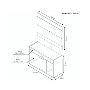 O Rack com Painel para TV 43 Polegadas Show Notável Móveis, fabricado em MDP dando maior durabilidade ao produto, ainda possui uma porta e nichos para auxiliar na organização do ambiente. Características: 1 Porta Nichos Acabamento acetinado, pintura UV Estrutura MDP 15mm Puxador em alumínio Dimensões do Rack: Altura: 68 cm Largura: 106 cm Profundidade: 37,5 cm Dimensões do painel: Altura: 85 cm Largura: 106 cm Profundidade: 3,5 cm Peso total: 33,5 kg Recomendações: Para maior durabilidade, recomenda-se que a limpeza dos móveis seja feita com pano limpo e levemente umedecido em água e sabão neutro. Em seguida, deverá ser passado um pano limpo e seco. Garantia do fornecedor: 3 meses.