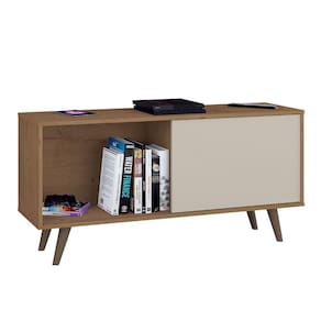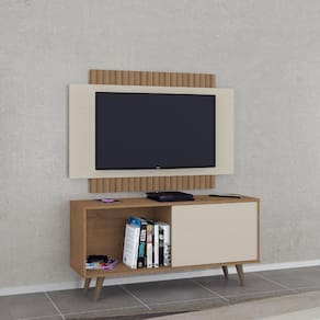 Aproveite o tampo do rack do painel para expor seus objetos de decoração, enquanto seus eletrônicos podem ser posicionados de forma prática abaixo tampo com uma bela porta de correr que ajuda na organização.