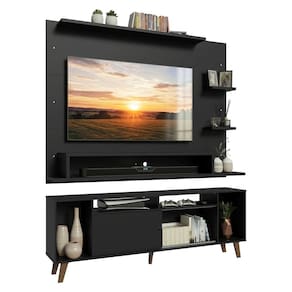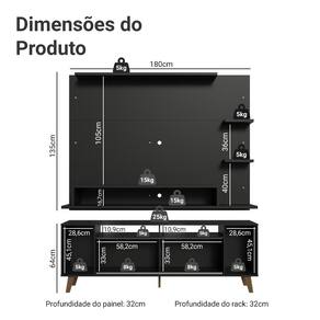O Painel para TV comporta TVs de até 60 polegadas e conta com espaço para passagem de fios e cabos, ajudando a manter tudo organizado. O Rack possui nichos de tamanhos variados, com espaços que facilitam a organização. Os pés elevam o móvel, melhoram a sustentação e completam o visual com um toque moderno.
