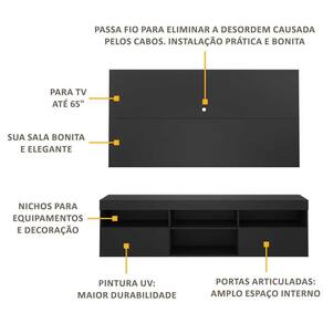 Produzido em MDP com pintura UV, que garante maior durabilidade e facilidade na limpeza, possui espaço para os equipamentos eletrônicos e nichos para objetos decorativos, além de duas portas articuladas com um amplo espaço interno para manter seus pertences organizados. O painel para TV de até 65 possui espaçamento para passagem dos fios, que permite deixar os cabos mais organizados. Devido as variações de tamanho dos televisores no mercado, sugerimos que verifique as medidas da sua TV e compare com o painel antes de efetuar a compra.