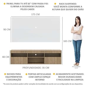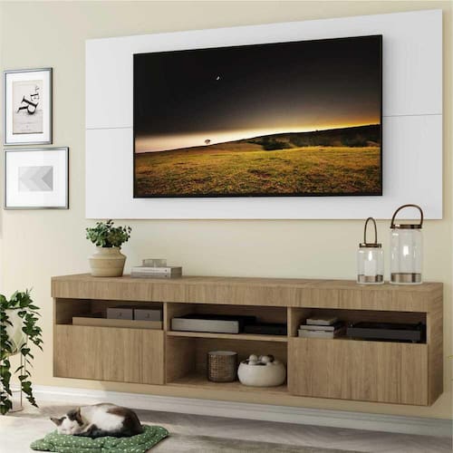 O Rack com Painel para TV até 65 polegadas com 2 portas suspenso Londres Multimóveis é produzido em MDP com acabamento acetinado, que garante maior durabilidade e facilidade na limpeza. Possui 4 nichos com espaço para os equipamentos eletrônicos e objetos decorativos, 2 portas articuladas com um amplo espaço interno para manter seus pertences organizados e ainda acompanha kit para ser montado de forma suspensa, conforme a altura que você quiser do chão. O painel para TV de até 65 possui espaçamento para passagem dos fios, que permite deixar os cabos mais organizados e o visual clean. A sala de estar é o melhor lugar para receber a família e amigos, por isso ter um ambiente bonito e aconchegante é fundamental.