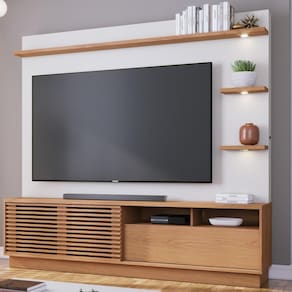 Uma ótima opção para quem busca por um móvel espaçoso e cheio de personalidade, o Home Theater Campeche possui um design clean e moderno. Com um painel para TVs de até 70 polegadas, possui três prateleiras superiores iluminadas por spots de Led, que trazem a sensação de tranquilidade e aconchego ao ambiente. Além disso, possui nichos internos e uma gaveta com corrediças telescópicas que são ideais para organização de aparelhos eletrônicos e demais objetos decorativos. Seu destaque fica por conta de sua porta deslizante ripada com brise que dão um toque especial do estilo contemporâneo ao móvel.