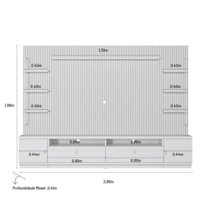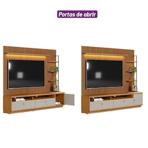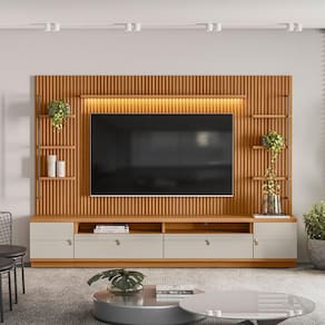 O Conjunto Rack Painel 2 Módulos laterais foi projetado para TV de até 75 polegadas. Possui tampo de 37mm de espessura, 2 gavetas e 2 portas de abrir com puxadores em couro. Conta ainda com 7 prateleiras para dispor objetos decorativos e duas hastes metálica. Seu painel ripado e a fita de Led deixam a sua sala ainda mais moderna. Acabamento: Pintura UV Acabamento da Gaveta: Pintura UV Acabamento da Porta: Pintura UV Acabamento da Prateleira: Pintura UV Acompanha Lâmpada: 01 Altura do Painel: 148 cm Altura do Rack: 50 cm Ambiente Principal: Sala de Estar Complexidade da Montagem: Média: pode ser montado por mais de uma pessoa e/ou necessite de maior conhecimento para montagem Cor: Marrom/Off White Cor do Produto: Marrom/Off White Escala de Brilho: Fosco Escala de Brilho da Porta: Fosco Escala de Brilho da Prateleira: Fosco Espessura do Painel: 17 cm Gaveta com Chave: Não Ideal para TVs até (Polegadas): 75 Itens Inclusos: 1 Conjunto Rack com Painel + 2 Modulo, Manual de Montagem e Kit de Ferragem. Largura do Painel: 268 cm Largura do Rack: 268 cm Manual de Especificação Técnica: https://cdn2.madeiramadeira.com.br/atributo/linea-brasil/1202681-painel-ouro-preto-810006067-v1.pdf Manual de Montagem e Instalação: https://cdn2.madeiramadeira.com.br/atributo/linea-brasil/1211303-rack-ouro-preto-painel-modulo.pdf Material da Gaveta: MDF/MDP Material da Porta: MDF Material da Prateleira: MDP Material dos Pés: Plástico Material Principal: MDF/MDP Montagem Flex: Sim. O Módulo Lateral é variável (Esquerdo ou Direito) Necessita Montagem: Sim Origem do Produto: Nacional Painel para TV Integrado: Sim Peso: 134.5 Peso do Painel: 35 kg Peso do Rack: 53 kg Peso Máximo por Gaveta: 3 Peso Máximo por Prateleira: 3 Possui Espelho: Não Possui iluminação: Sim Possui Nichos: 02 Possui Pés: Não Possui Portas: 02 Possui Prateleiras: 07 Possui Tomada: Não Profundidade do Rack: 41 cm Recomendações de Uso, Manutenção e Limpeza: Realizar a limpeza com um pano levemente umedecido em água. Sapatas Niveladoras: Sim Sistema de Montagem: Cavilhas, Parafusos e Minifix Suporte de TV Universal Incluso: Não Tipo de Corrediça da Gaveta: Metálica Telescópica Tipo de Dobradiça/Corrediça da Porta: Metálica Tipo de Porta: Bater Tipo de Puxador da Gaveta: Externo Tipo de Puxador da Porta: Externo