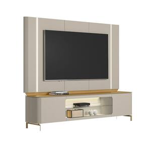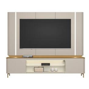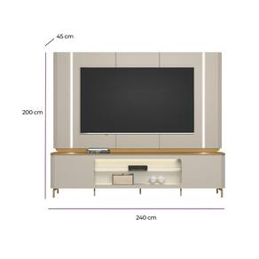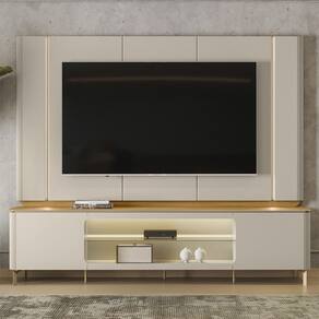 Características: 2 Nichos 2 Portas com detalhe arredondado e chanfrado Detalhes Curvos Dobradiça com amortecedor caneca 35mm Estrutura em MDF 15mm Ideal para TVs de até 75 polegadas Moldura curva revestida canelada Pés e dobradiças Metálicas Possui passa fios e fita de LED Prateleira de vidro 1210x330x6mm Tampo com detalhe arredondado 9mm Tampo flex