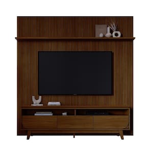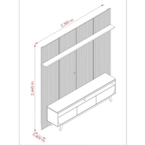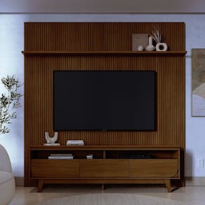 Painel em MDF frisado (baixo relevo), três gavetas com corrediças telescópicas, gavetas laterais com detalhe curvo, tampo da bancada suspenso em 25mm com borda chanfrada, pés usinados, estrutura com chapas em MDP e MDF de 12, 15 e 25mm. Produto Montado: Sim Acabamento: Pintura UV Acabamento da Gaveta: Pintura UV Acabamento da Prateleira: Pintura UV Acabamento dos Pés: Pintura Altura do Painel: 244,5 cm Altura do Rack: 62,5 cm Altura dos Pés: 7,5 cm Altura Máxima dos Pés: 7.5000 Ambiente Principal: Sala de Estar codigo_ean: 7900288101228 Complexidade da Montagem: Média: pode ser montado por mais de uma pessoa e/ou necessite de maior conhecimento para montagem Cor: Cumaru Cor do Produto: Cumaru Escala de Brilho: Semi-Brilho Escala de Brilho da Gaveta: Semi-Brilho Escala de Brilho da Prateleira: Semi-Brilho Espessura do Painel: 18,5 cm Espessura do Tampo: 25 mm Gaveta com Chave: Não Ideal para TVs até (Polegadas): 75 Itens Inclusos: 1 Rack, 1 Painel, 1 Manual de Montagem Largura do Painel: 238 cm Largura do Rack: 200 cm Manual de Especificação Técnica: https://product-hub-prd.madeiramadeira.com.br/982050/documents/f24125af-4a4b-4a10-8c38-c8016d2bd141275495482617424811399484.pdf Manual de Montagem e Instalação: https://product-hub-prd.madeiramadeira.com.br/982050/documents/bb838a4b-aab3-43d1-9854-5894eb2cf1a2275495382617424811366352.pdf Marca: Madetec Material da Gaveta: MDF/MDP Material da Prateleira: MDP Material dos Pés: MDP Material Principal: MDF/MDP Necessita Montagem: Sim Peso do Painel: 73 kg Peso do Rack: 54,4 kg Peso Máximo por Gaveta: 5 kg Peso Máximo por Prateleira: 5 kg Possui Espelho: Não Possui iluminação: Não Possui Passa Cabos: Sim Possui Pés: 05 Possui Portas: Não Possui Tomada: Não Possui Vidro: Não Profundidade do Painel: 18.5000 Profundidade do Rack: 36 cm Quantidade de Gavetas: 03 Gavetas Quantidade de Nichos: Não Recomendações de Uso, Manutenção e Limpeza: "Para a limpeza utilizar um pano limpo e seco. Não limpar com produtos abrasivos ou escovas;Não deixar exposta à luz do sol diretamente pois isso irá diminuir a vida útil do produto;Este produto Não é recomendado Para ambientes externos onde possa receber chuva." Sapatas Niveladoras: Não Sistema de Montagem: Girofix Suporte de TV Universal Incluso: Não Tipo de Corrediça da Gaveta: Metálica Telescópica Tipo de Puxador da Gaveta: Embutido