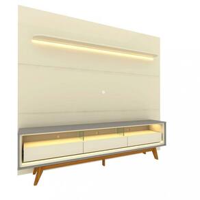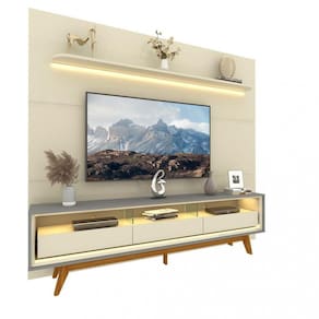 Características: Estrutura em MDP e MDF Prateleiras com cantos curvos Veios decorativos de 42mm Gavetas com design flutuante e corrediças telescópicas LED em tom quente com difusor Suporta TVs de até 85 polegadas