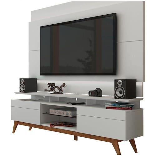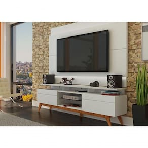 Conjunto rack + painel: organiza TV, eletrônicos e decoração em um só móvel.