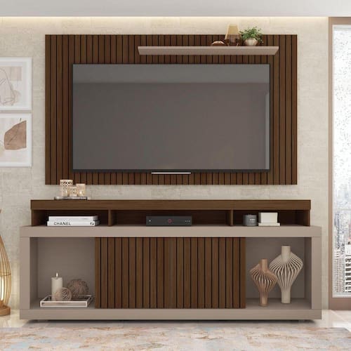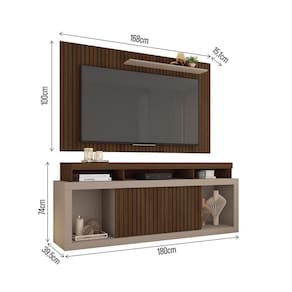 O Rack com Painel Esmeralda, são ideais para a sua sala de TV. Com muito estilo e requinte, irão abrilhantar seu ambiente com uma estrutura decorativa moderna e sofisticada e que está super em alta no design de interiores, deixa o ambiente mais aconchegante e ajuda a camuflar fios que contribuirão para deixar seu espaço mais organizado. Um produto de excelente qualidade, conta ainda com duas portas deslizantes promovendo mais espaço e acomodações perfeitas.. Acabamento: Pintura UV Acabamento da Porta: Pintura UV Acabamento dos Pés: Poliéster Altura do Conjunto: 174 cm Altura do Painel: 100 Altura do Rack: 74 Altura dos Pés: 3 Ambiente Principal: Sala de Estar Complexidade da Montagem: Média: pode ser montado por mais de uma pessoa e/ou necessite de maior conhecimento para montagem Cor: Havana/Cinza Cor do Produto: Havana/Cinza Cor Flex: Não Cor Interna: Cinza Escala de Brilho: Fosco Escala de Brilho da Porta: Fosco Espessura do Painel: 15.1 Ideal para TVs até (Polegadas): 65 Itens Inclusos: 1 Painel com Rack, Kit Ferragens e Manual de Montagem Largura do Painel: 168 Largura do Rack: 180 Manual de Montagem e Instalação: https://cdn2.madeiramadeira.com.br/atributo/caemmun-moveis/1274915-esquema-new-oscar-ed-a.pdf Material da Porta: MDF Material do Puxador da Porta: MDF Material dos Pés: Plástico Material Principal: MDF/MDP Montagem Flex: Não Necessita Montagem: Sim Origem do Produto: Nacional Peso do Painel: 24.55 Peso do Rack: 37.5 Possui Espelho: Não Possui iluminação: Não Possui Pés: 08 Possui Portas: 02 Possui Prateleiras: Não Possui Tomada: Não Possui Vidro: Não Profundidade do Rack: 39.5 Recomendações de Uso, Manutenção e Limpeza: Limpar com pano macio levemente umedecido e em seguida pano macio seco. Não utilizar produtos abrasivos (lixas, esponjas) e/ou produtos a base de solventes (thinner, aguarrás). Rodízio com Trava: Sim Sapatas Niveladoras: Não Sistema de Montagem: 1 Painel, 1 Rack , Kit Ferragens e Manual de Montagem Suporte de TV Universal Incluso: Não Tipo de Dobradiça/Corrediça da Porta: Metálica Tipo de Porta: Correr Tipo de Puxador da Porta: Embutido