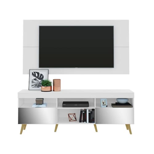Produzido em MDP com pintura UV, que garante maior durabilidade e facilidade na limpeza, possui espaço para os equipamentos eletrônicos e nichos para objetos decorativos, além de duas portas articuladas com espelho e um amplo espaço interno para manter seus pertences organizados. Opainel para TV de até 65possui espaçamento para passagem dos fios, que permite deixar os cabos mais organizados. Devido as variações de tamanho dos televisores no mercado, sugerimos que verifique as medidas da sua TV e compare com o painel antes de efetuar a compra. Os espelhos são de vidro (o que evita que a imagem fique distorcida) e lapidados, ou seja, passam por um processo para que as bordas não fiquem cortantes, o que garante maior segurança. Ospés palito, estilo retrô, em polipropileno, dão um charme especial ao móvel deixando-o com um visual leve e permitindo você compor um ambiente com ar vintage e moderno ao mesmo tempo.