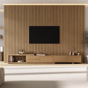 O Rack com painel Aruá traz a essência do estilo japandi, inspirado na simplicidade oriental e no equilíbrio entre forma e função. O rack possui um design baixo com acabamento em Jatobá, ferragens premium, unindo sofisticação e praticidade. Já os painéis são produzidos em chapas de 15mm e oferecem modularidade e personalização do espaço. Versáteis, podem ser utilizados como revestimentos de parede ou painéis de TV, transformando o ambiente com harmonia e elegância. Produto Montado: Sim Acabamento: Finish Foil Acabamento da Porta: Finish Foil Acabamento dos Pés: Finish Foil Altura do Conjunto: 230 cm Altura do Painel: 230 cm Altura do Rack: 35,7 cm Altura dos Pés: 5.5 Altura Máxima dos Pés: 5.5000 Ambiente Principal: Sala de Estar codigo_ean: 7900288310224 Complexidade da Montagem: Média: pode ser montado por mais de uma pessoa e/ou necessite de maior conhecimento para montagem Cor: Jatobá Cor do Produto: Jatobá Escala de Brilho: Semi-Fosco Escala de Brilho da Porta: Semi-Fosco Espessura do Painel: 4,5 cm Espessura do Tampo: 40 mm Fixação na Parede: Sim Itens Inclusos: Painel com Rack, Manual de Montagem e Kit Ferragens Largura do Conjunto: 320 cm Largura do Rack: 210 cm Linha ou Coleção: Aruá Manual de Montagem e Instalação: https://product-hub-prd.madeiramadeira.com.br/379704376/documents/0dc13b40-d93f-464a-a62e-030d35a942fe3355836342817684081134827.pdf Marca: CabeCasa MadeiraMadeira Material da Porta: MDP Material dos Pés: MDP Material Principal: MDP Montagem Flex: Sim, aparador monta o lado esquerdo e direito Necessita Montagem: Sim Origem do Produto: Nacional Peso do Painel: 142,6 kg Peso do Rack: 44,45 kg Possui Espelho: Não Possui iluminação: Não Possui Passa Cabos: Não Possui Pés: 01 Possui Prateleiras: Não Possui Tomada: Não Possui Vidro: Não Profundidade do Conjunto: 42 cm Profundidade do Rack: 37,5 cm Recomendações de Uso, Manutenção e Limpeza: A limpeza deve ser feita com pano macio, levemente umedecido com água e sabão neutro. Em seguida, passe um pano seco para evitar o acúmulo de umidade. Nunca utilize produtos abrasivos, esponjas de aço, alvejantes, álcool em excesso ou solventes, pois esses produtos podem agredir o acabamento e comprometer sua aparência. Sapatas Niveladoras: Não Sistema de Montagem: Parafusos e cavilhas Suporte de TV Universal Incluso: Não Tipo de Dobradiça/Corrediça da Porta: Metálica Tipo de Porta: Basculante Tipo de Puxador da Porta: Embutido