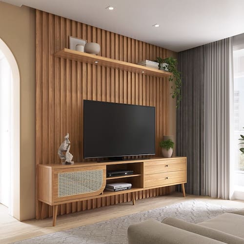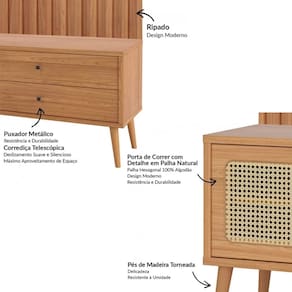 Características: Estrutura 100% MDF Acabamento em Pintura UV Design Moderno Ripado 3D Detalhes em Palha Natural Pés em Madeira Torneada 02 Gavetas com Corrediças Telescópicas 01 Porta de Correr Palha Hexagonal 100% Algodão Puxadores Metálicos Acompanha LED Ideal para TV até 75 Polegadas