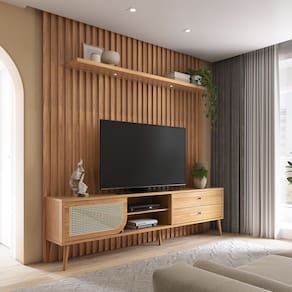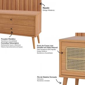 Características: Estrutura 100% MDF Acabamento em Pintura UV Design Moderno Ripado 3D Detalhes em Palha Natural Pés em Madeira Torneada 02 Gavetas com Corrediças Telescópicas 01 Porta de Correr Palha Hexagonal 100% Algodão Puxadores Metálicos Acompanha LED Ideal para TV até 75 Polegadas