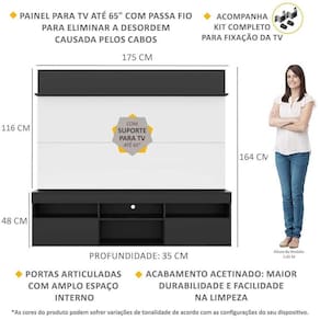Dimensões do produto montado: Altura: 164cm | Largura: 175cm | Profundidade: 35cm *Devido as variações de tamanho dos televisores no mercado, sugerimos que verifique as medidas da sua TV e compare com o painel antes de efetuar a compra. *Você pode consultar as medidas internas na imagem técnica do produto.