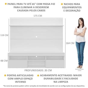 O Rack com Painel TV 65" Madri Multimóveis é produzido em MDP com acabamento acetinado (cerca de 20% de brilho), que garante maior durabilidade e facilidade na limpeza, possui 4 nichos com espaço para os equipamentos eletrônicos, além de 2 portas articuladas com um amplo espaço interno para manter seus pertences organizados. O painel para TV de até 65 (suporta até 30 Kg) com espaçamento para passagem dos fios, que permite deixar os cabos mais organizados e o visual clean, ainda possui uma prateleira para os objetos decorativos. Seu ambiente bonito e confortável para curtir os melhores filmes e séries.