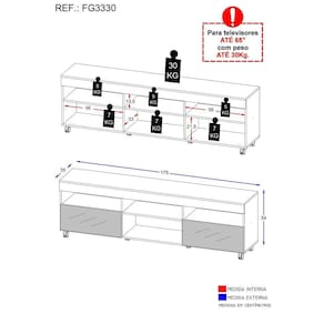 Dimensões do produto montado: Altura: 54cm | Largura: 175cm | Profundidade: 35cm *Devido as variações de tamanho dos televisores no mercado, sugerimos que verifique as medidas da sua TV e compare com o rack antes de efetuar a compra. *Você pode consultar as medidas internas na imagem técnica do produto.