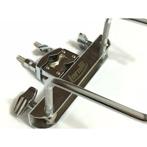 Rack cromado duplo- fixador para colocar em estantes diversas- comporta cowbells, pandeiros, timbalitos e acessórios em geral- compatível com a maioria das estantes de pratos- mini rack cromado com 2 hastes - fabricante: torelli- modelo: ta-402