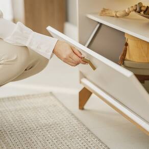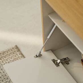 Nicho: 2 Passa Fios: 2 Porta: 2 portas basculantes em MDP com espessura de 15mm Tampo: 15mm material em MDP Pés: 4 pés de madeira em 12cm de altura Dobradiças: 4 dobradiça metálica Luminária: 1 luminária em Led