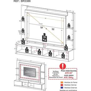 Dimensões do produto montado: Altura: 171cm | Largura: 213cm | Profundidade: 38cm Painel - Altura: 98cm | Largura: 150cm *Devido as variações de tamanho dos televisores no mercado, sugerimos que verifique as medidas da sua TV e compare com o painel antes de efetuar a compra. *Você pode consultar as medidas internas na imagem técnica do produto.