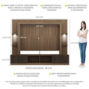 Dimensões do produto montado: Altura: 171cm | Largura: 213cm | Profundidade: 38cm Painel - Altura: 98cm | Largura: 150cm *Devido as variações de tamanho dos televisores no mercado, sugerimos que verifique as medidas da sua TV e compare com o painel antes de efetuar a compra. *Não recomendamos utilizar suporte de TV articulado. *Você pode consultar as medidas internas na imagem técnica do produto.