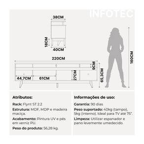 O Rack Flynt ST é a escolha ideal para quem busca funcionalidade e estilo moderno. Com 220 cm de largura, oferece amplo espaço para organizar aparelhos eletrônicos e acomodar TVs de até 75 polegadas. Feito em MDF e com pés altos em madeira Tauari com acabamento em verniz, possui portas laterais com puxadores usinados proporcionando praticidade e elegância.