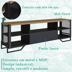 Rack Industrial 180 Cm Gaveta E Tela Em Metal 1017, acrescenta modernidade e beleza à qualquer decoração, pois dispõe de materiais de alta qualidade e estética atemporal. Possui tampo, prateleiras e gaveta em MDP, sendo o tampo de 30 mm de espessura, prateleiras e gaveta de 15 mm, base de tubo em aço 20 mm e telas de aço expandido nas laterais, agregando design e segurança ao armazenar seus itens. Possui gaveta com corrediças telescópicas e amplo espaço para armazenamento, para que seus itens mais utilizados e/ou decoração sejam sempre destaque em sua sala. Suporta até 30 Kg distribuídos. Sua qualidade de construção irá lhe surpreender! Este móvel chegará na sua casa separado em 02 volumes.