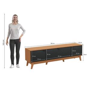 A caixaria, em pintura touch na cor canela, conta com a textura dos veios da madeira, enquanto as portas são na cor preto fosco com detalhe em alto-relevo geométrico, completando a beleza do produto. Uma combinação marcante e moderna para todos os espaços e tipos de decoração. Com duas portas laterais e uma porta basculante central, com pistão a gás, ele proporciona amplo espaço para guardar seus itens com praticidade, deixando sua sala de estar sempre organizada.