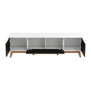 Acabamento: Pintura Fosco / Pintura Touch / Brilho | Cor: Branco/Preto fosco | Dobradiça: Com Amortecimento | Garantia: 3 meses para de fabricação | Matéria-prima: MDF / MDP | Peso máximo suportado: 30kg | Puxadores: Puxador embutido | Quantidade de portas: 3 | Sistema de montagem: Parafuso Philips / Sistema Allen e Minifix | Tipo de porta: Bater | Altura: 52,5 | Profundidade: 42 | Largura: 180 | Requer montagem: Sim | Quantidade de caixas de embalagem: 2 | Formato do móvel: Rack