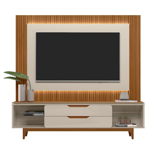 Nicho: 4 nichos Porta: não há Gavetas: 2 gavetas com corrediças telescópicas Prateleiras: 2 prateleiras de vidro Pé: 5 pés de madeira maciça com altura de 18cm