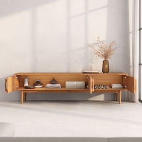 O Rack Madeira Maciça Minimalista Tecca traduz o essencial com personalidade. Feito inteiramente em madeira maciça com acabamento natural Freijó, ele realça os veios e as nuances únicas da madeira, reforçando a beleza do que é simples, bem-feito e duradouro. Seu visual limpo e funcional abriga três portas com puxadores verticais também em madeira, criando um ritmo visual orgânico e discreto.