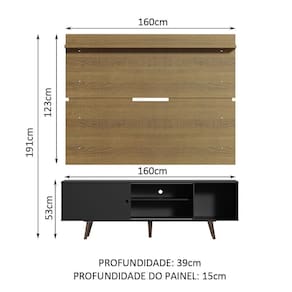 O acabamento do rack é preto com pés em amadeirado Rustic. O do painel é todo em amadeirado Rustic. O processo é feito em Poliéster Protetor ecológico com 7 camadas, detalhe que confere maior durabilidade e qualidade.