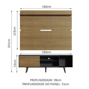 O acabamento do rack combina os tons amadeirado Rustic e preto. O painel possui pintura em amadeirado Rustic. O do painel é todo em amadeirado Rustic. O processo é feito em Poliéster Protetor ecológico com 7 camadas, detalhe que confere maior durabilidade e qualidade.