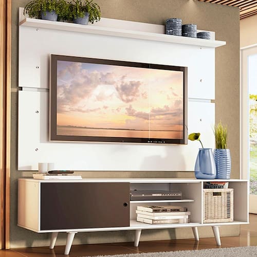 O painel comporta TV de até 65 polegadas e contempla uma prateleira na parte superior, perfeita para objetos decorativos. Por ser separado do rack, pode ser fixado na altura desejada.